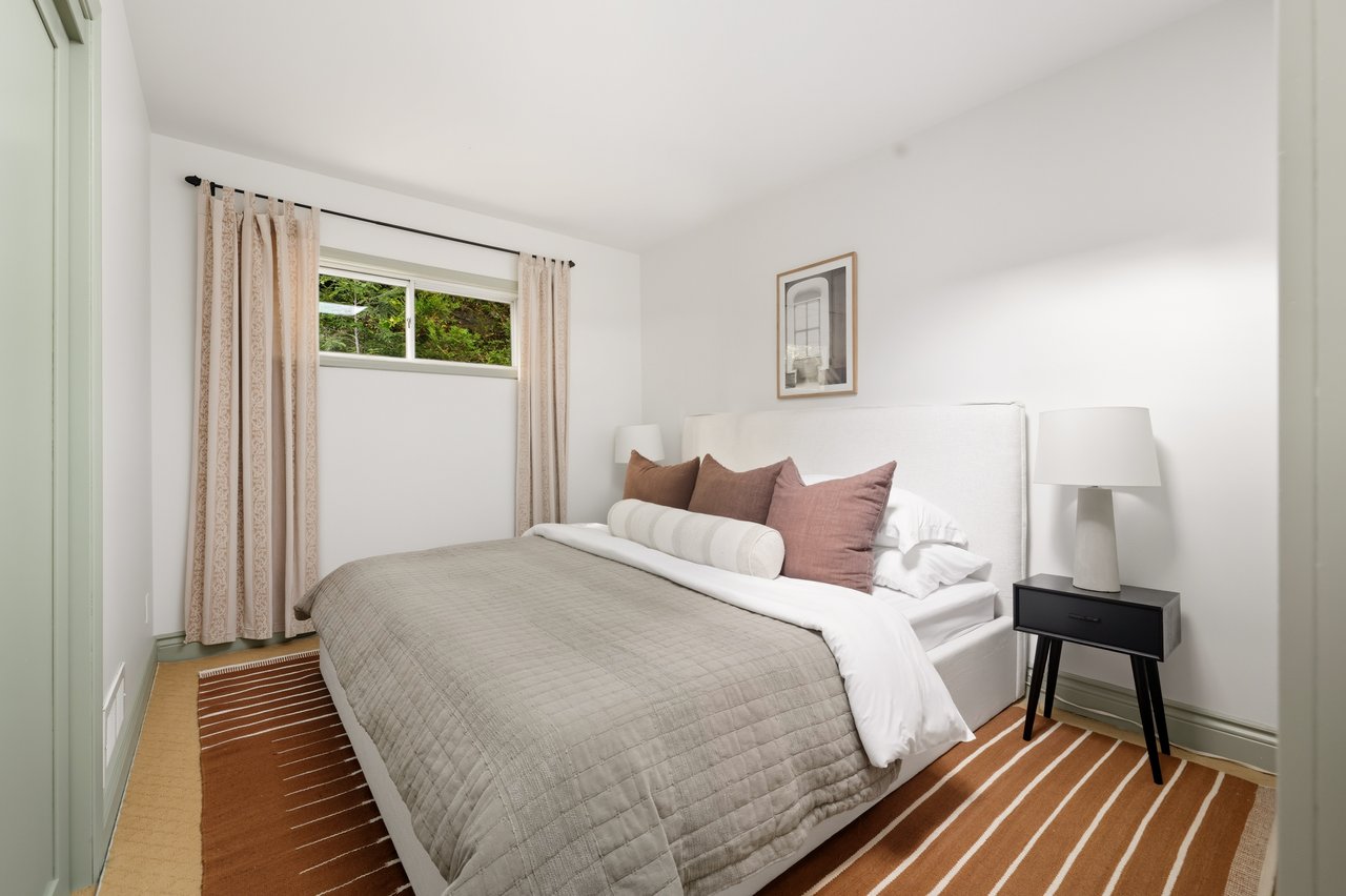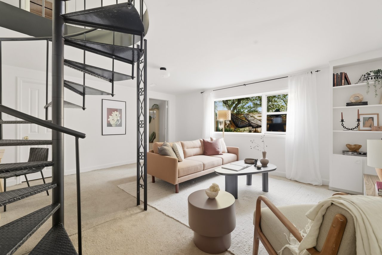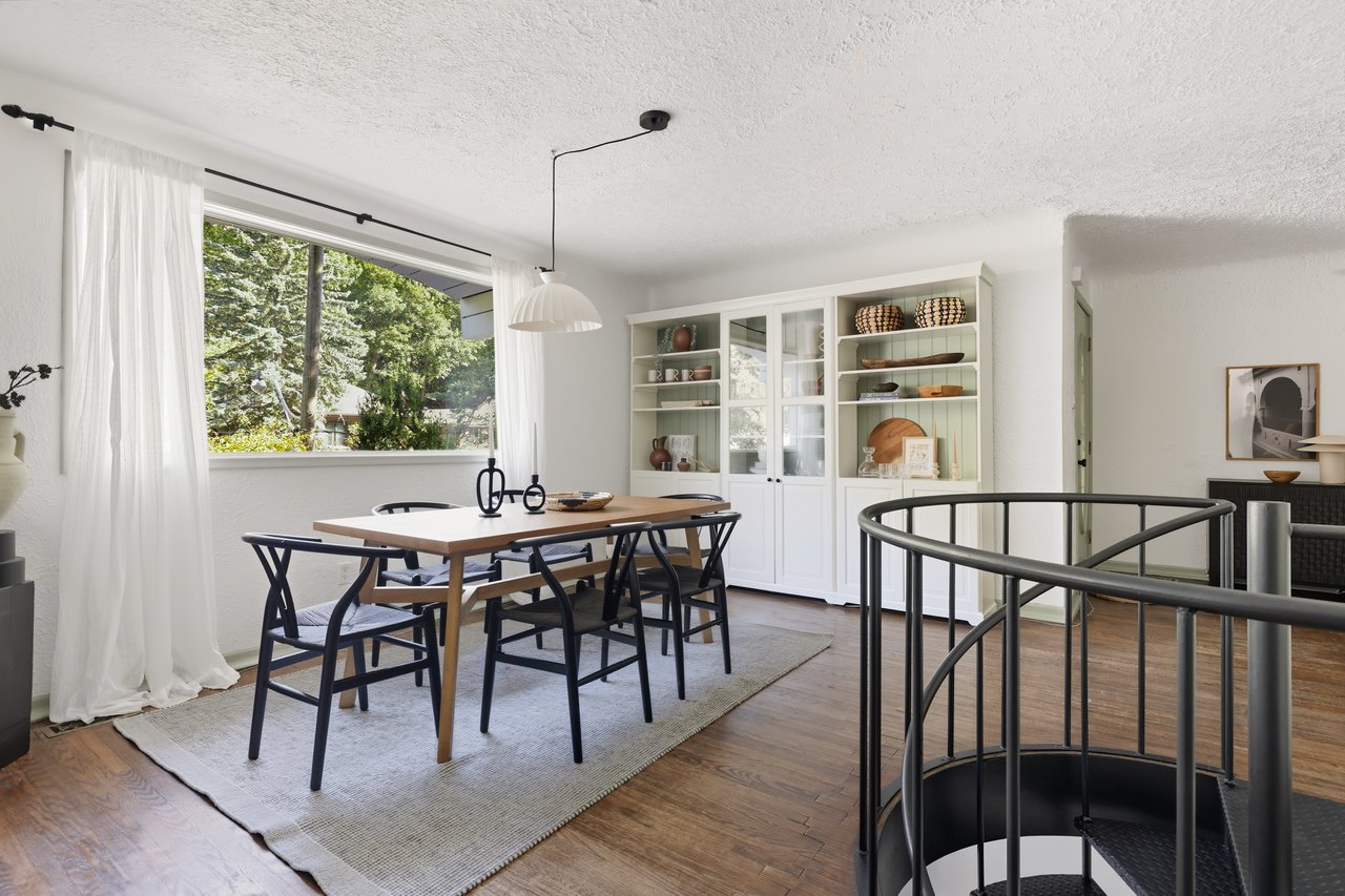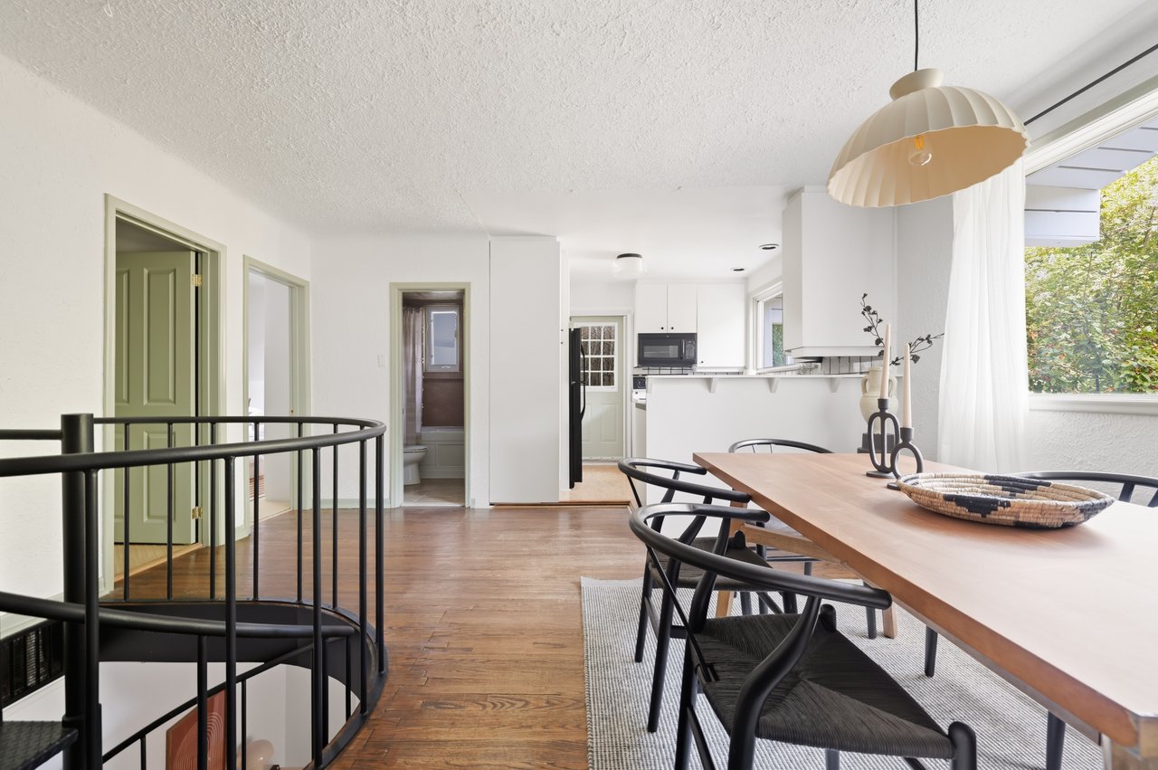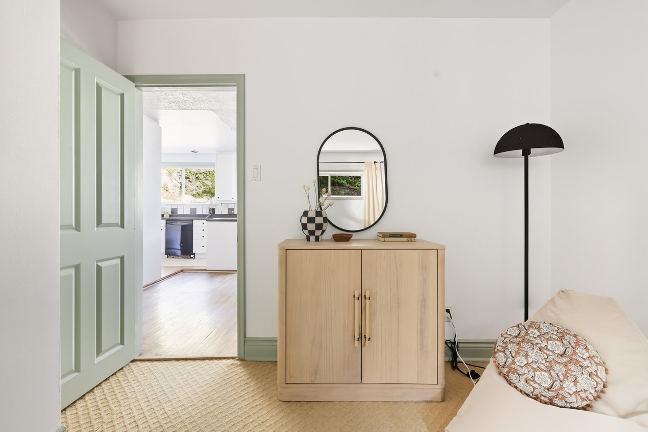 Inside, the kitchen is surprisingly efficient, designed to make the most of every inch, with a large window framing the trees and a side door to the porch. The layout makes daily life feel effortless, with flexible spaces for guests, work, or creative pursuits.