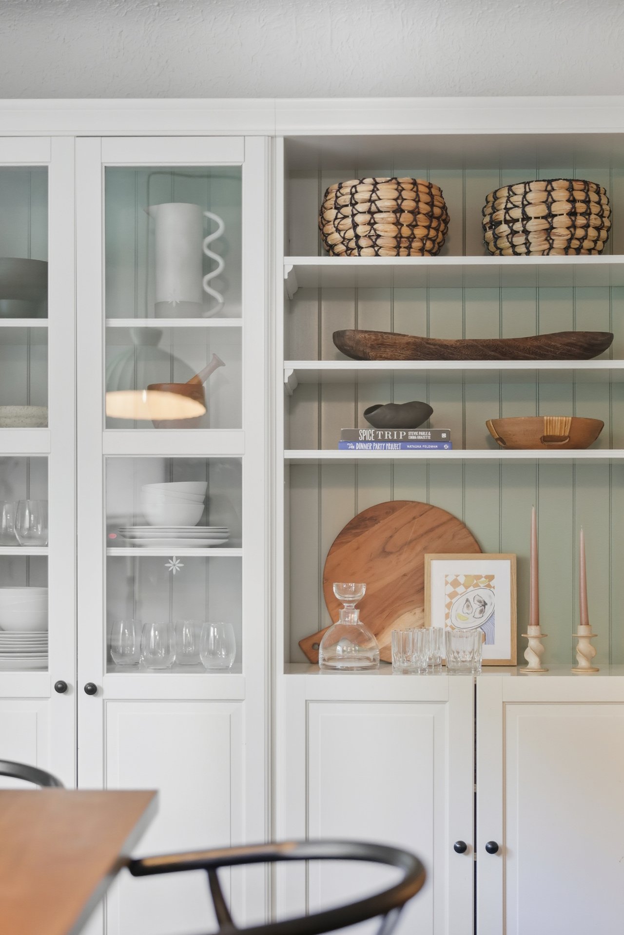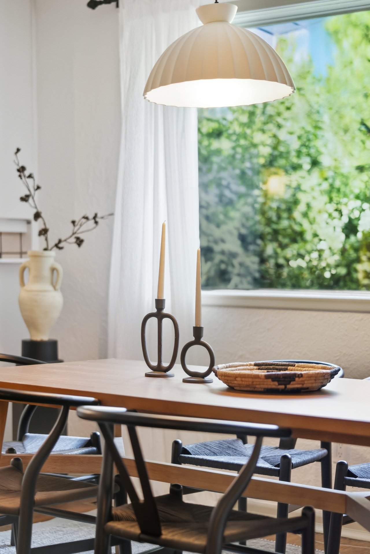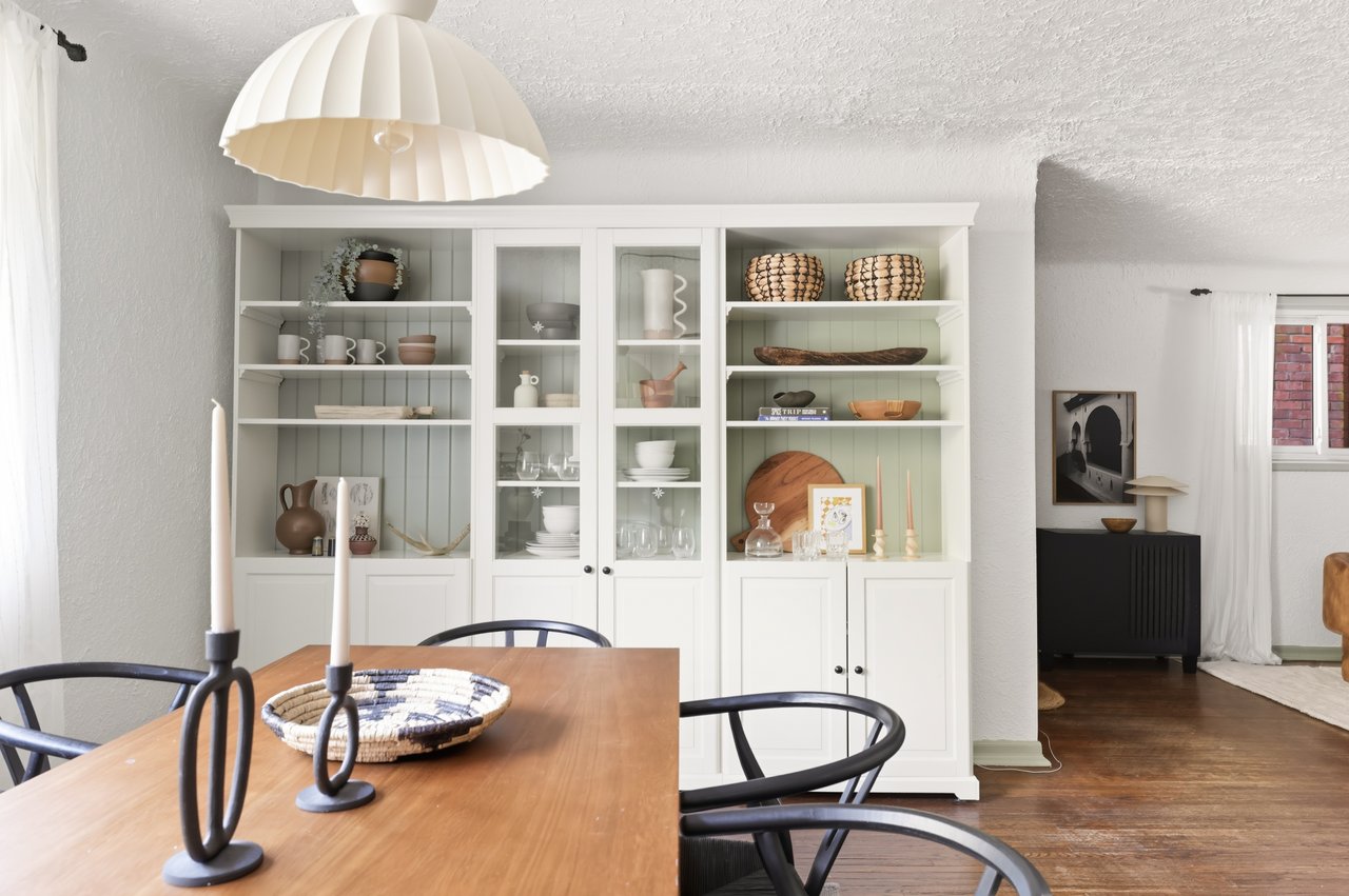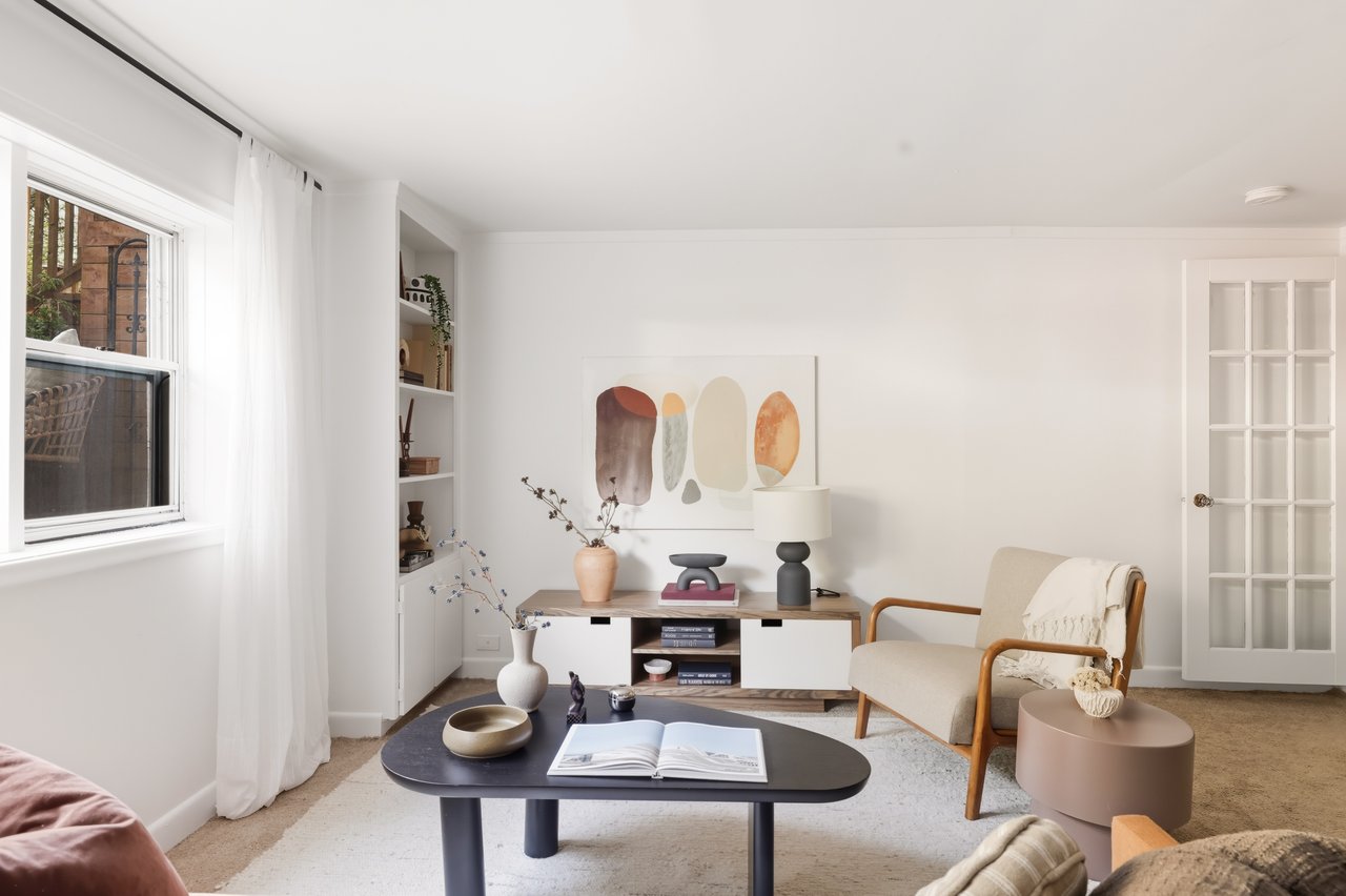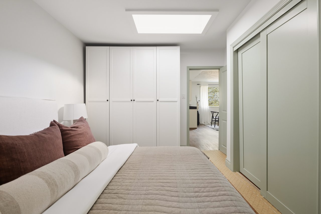Inside, the kitchen is surprisingly efficient, designed to make the most of every inch, with a large window framing the trees and a side door to the porch. The layout makes daily life feel effortless, with flexible spaces for guests, work, or creative pursuits.