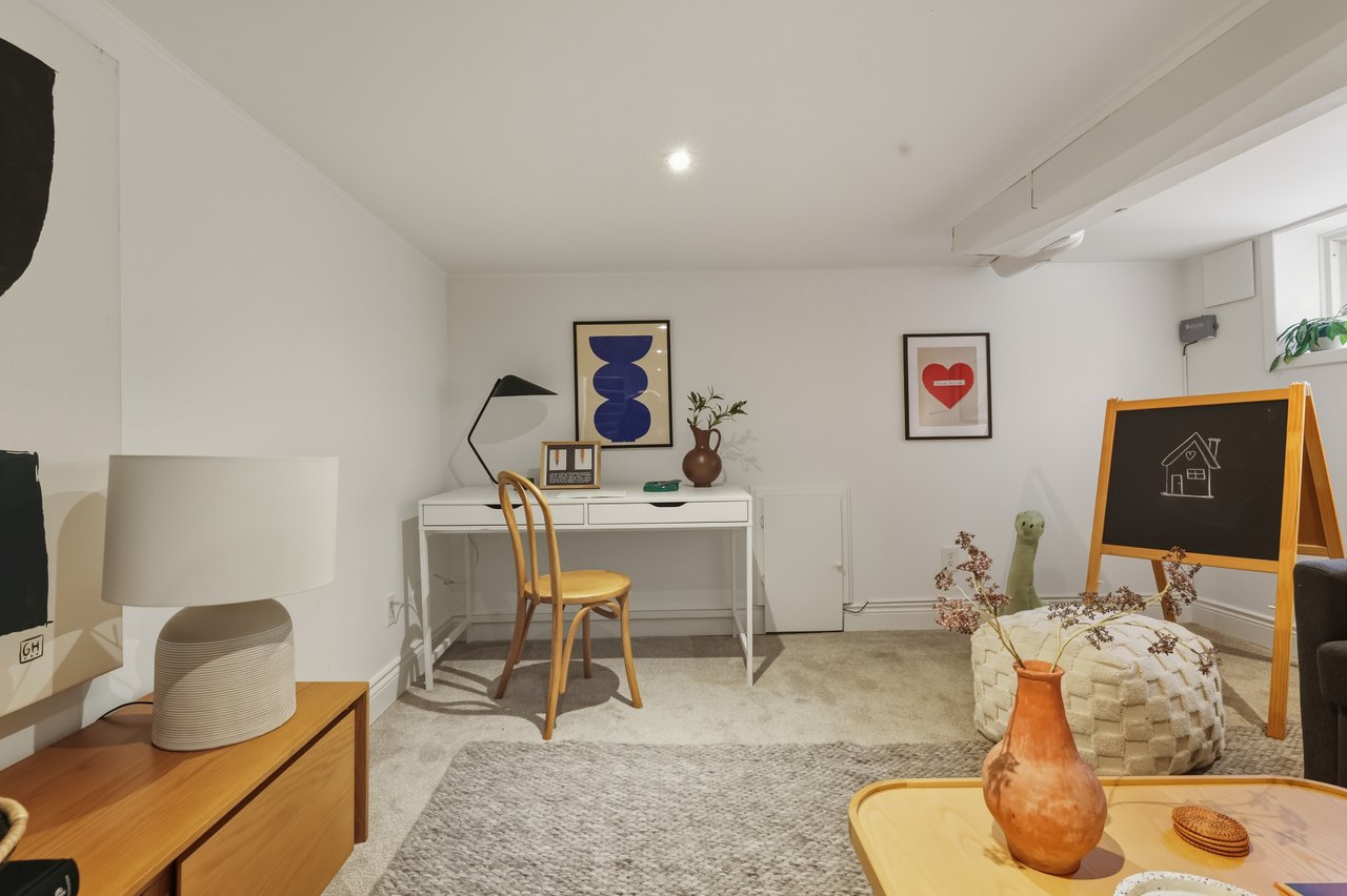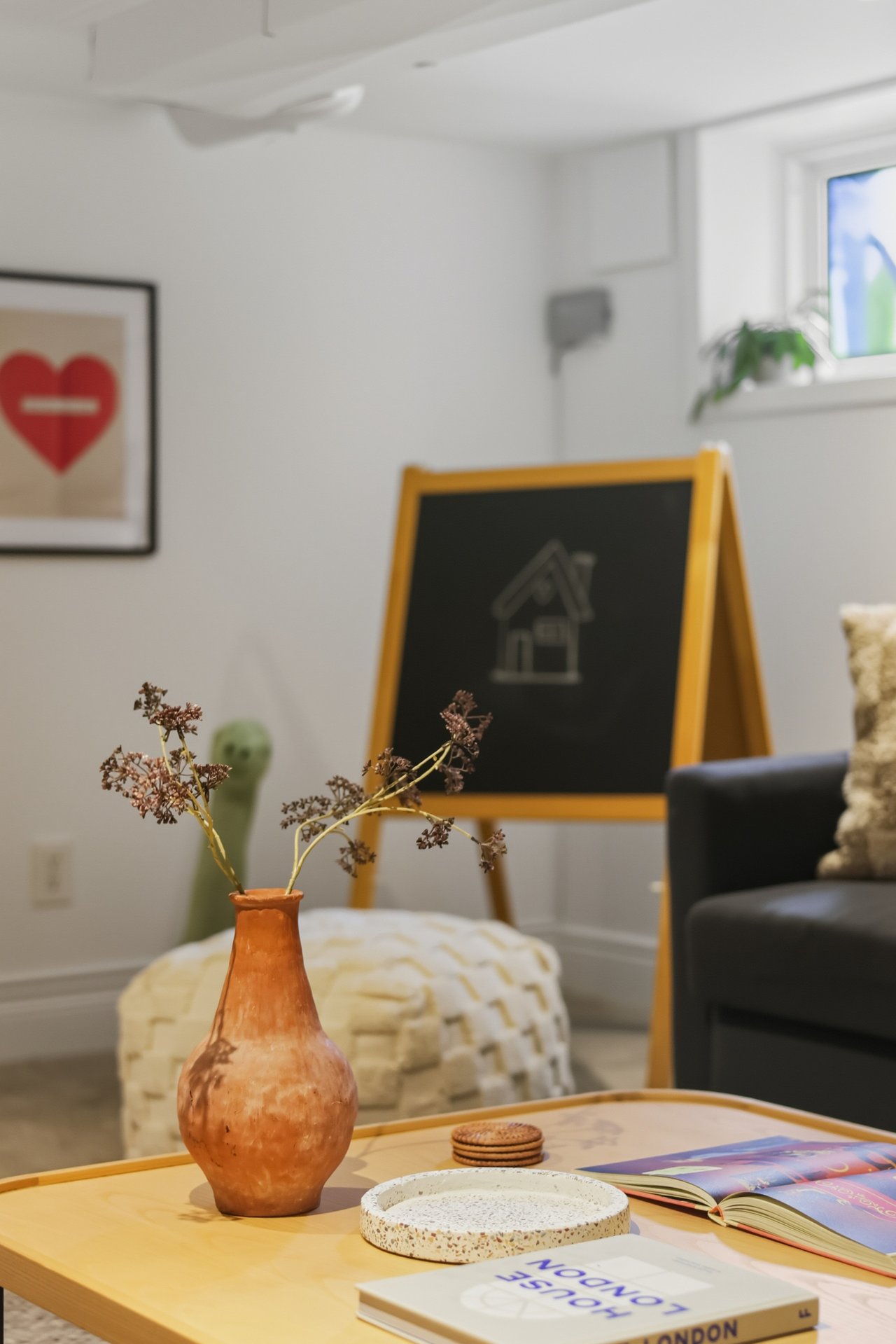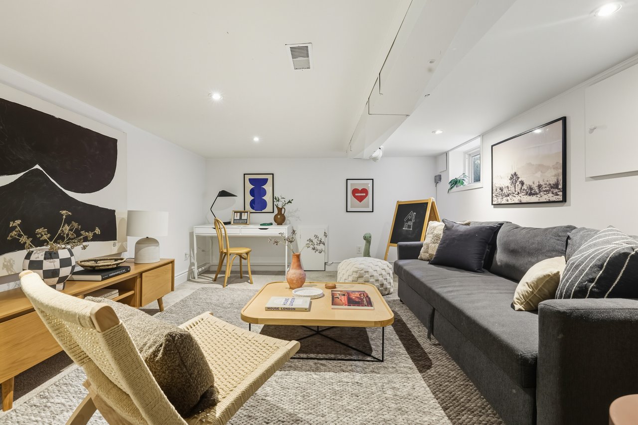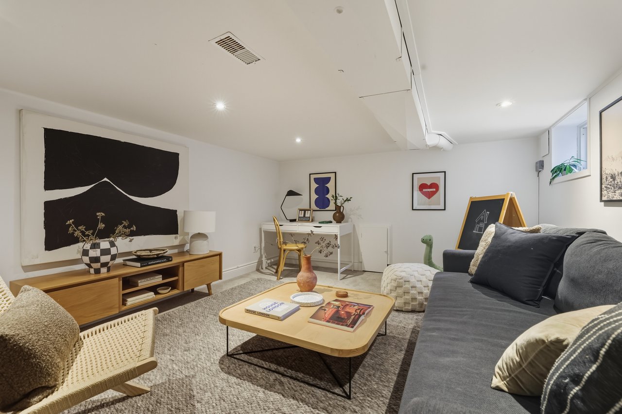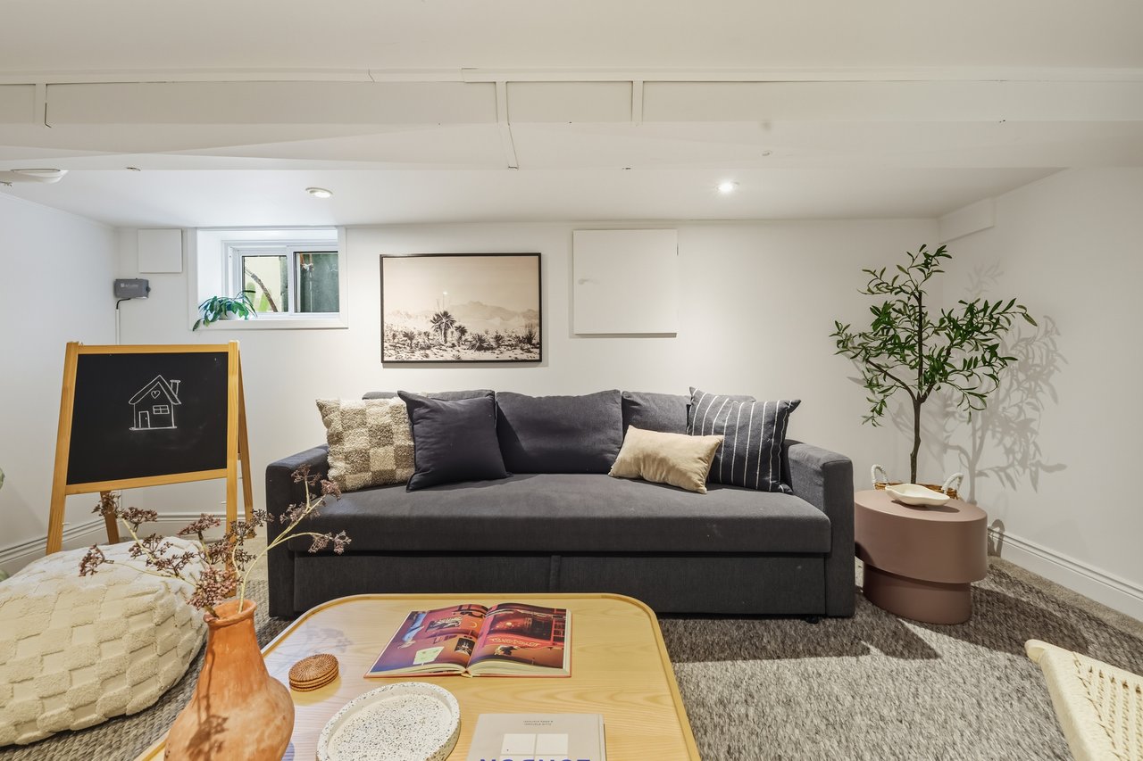 The basement is a space where cozy movie nights happen, with toys and play areas tucked away, keeping the rest of the home tidy.