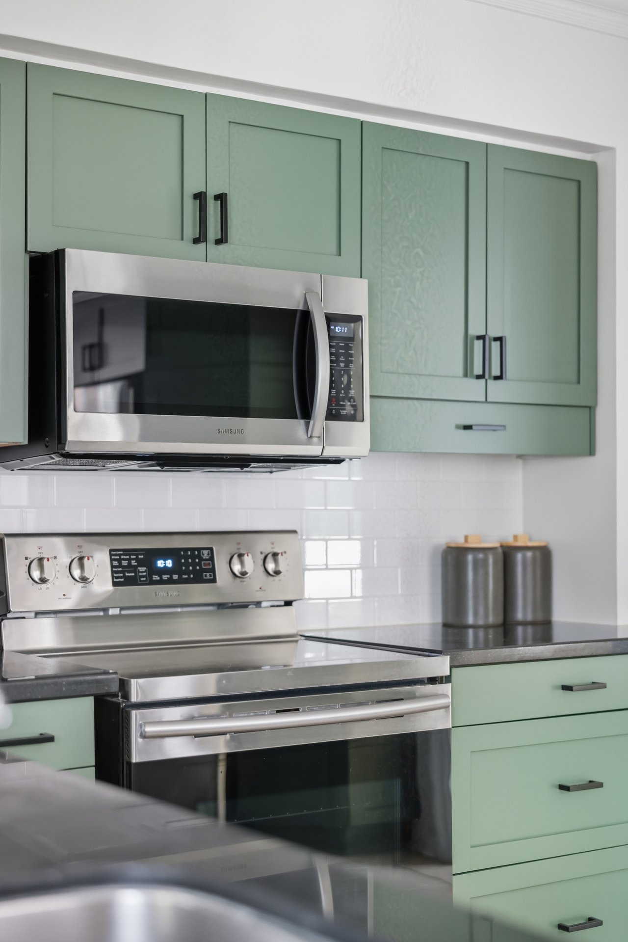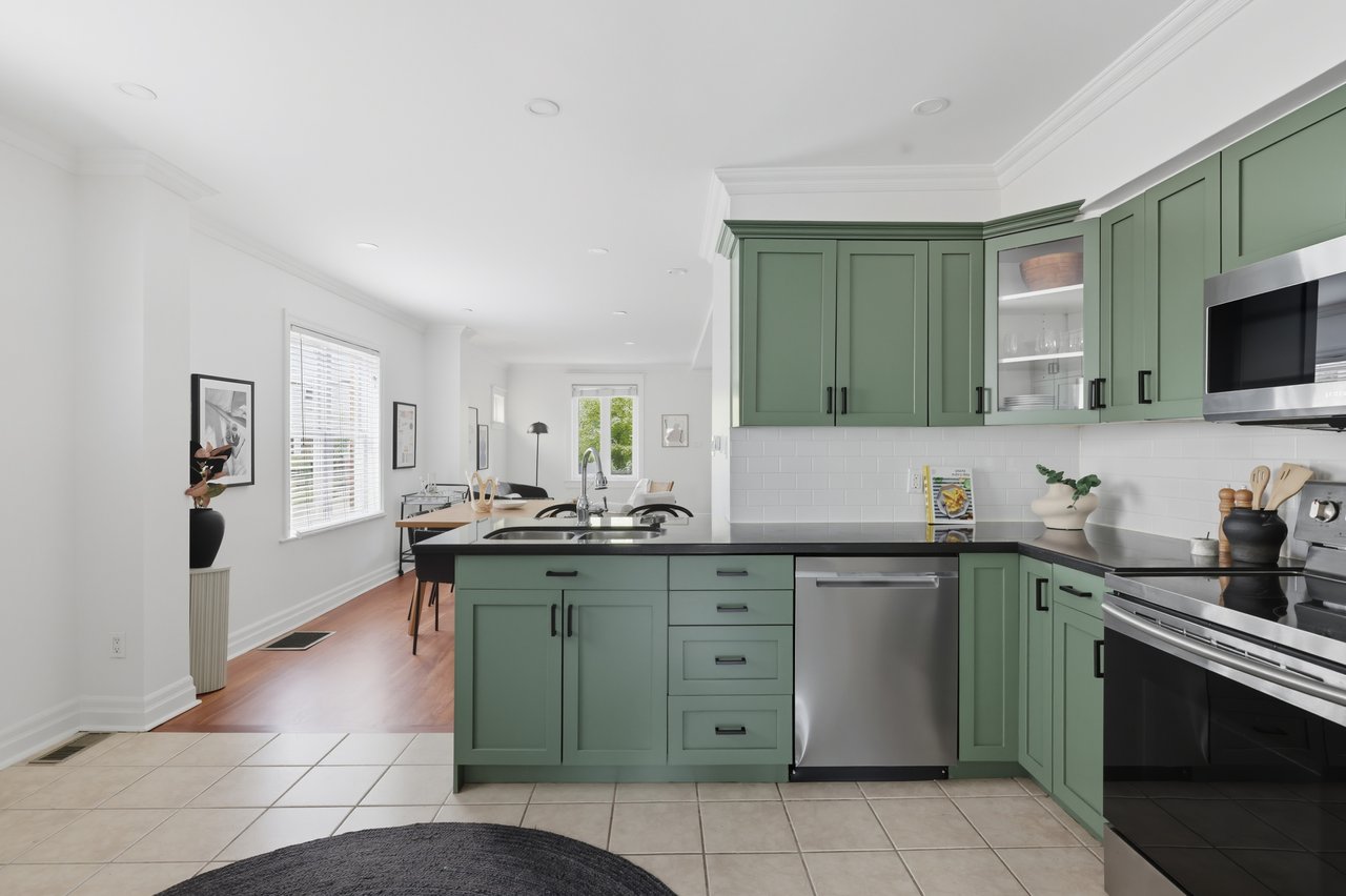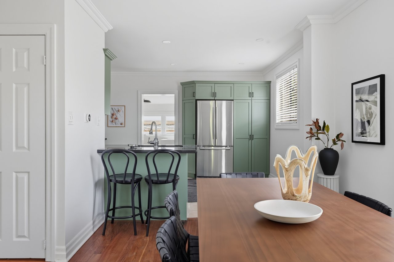 The kitchen is the kind you actually cook in. Big, practical, with storage for everything and counters that never seem to run out of space. It flows into living and dining areas that open to the backyard, where new stonework, a section of low-maintenance turf, and thoughtful landscaping turn it into another room of the house.