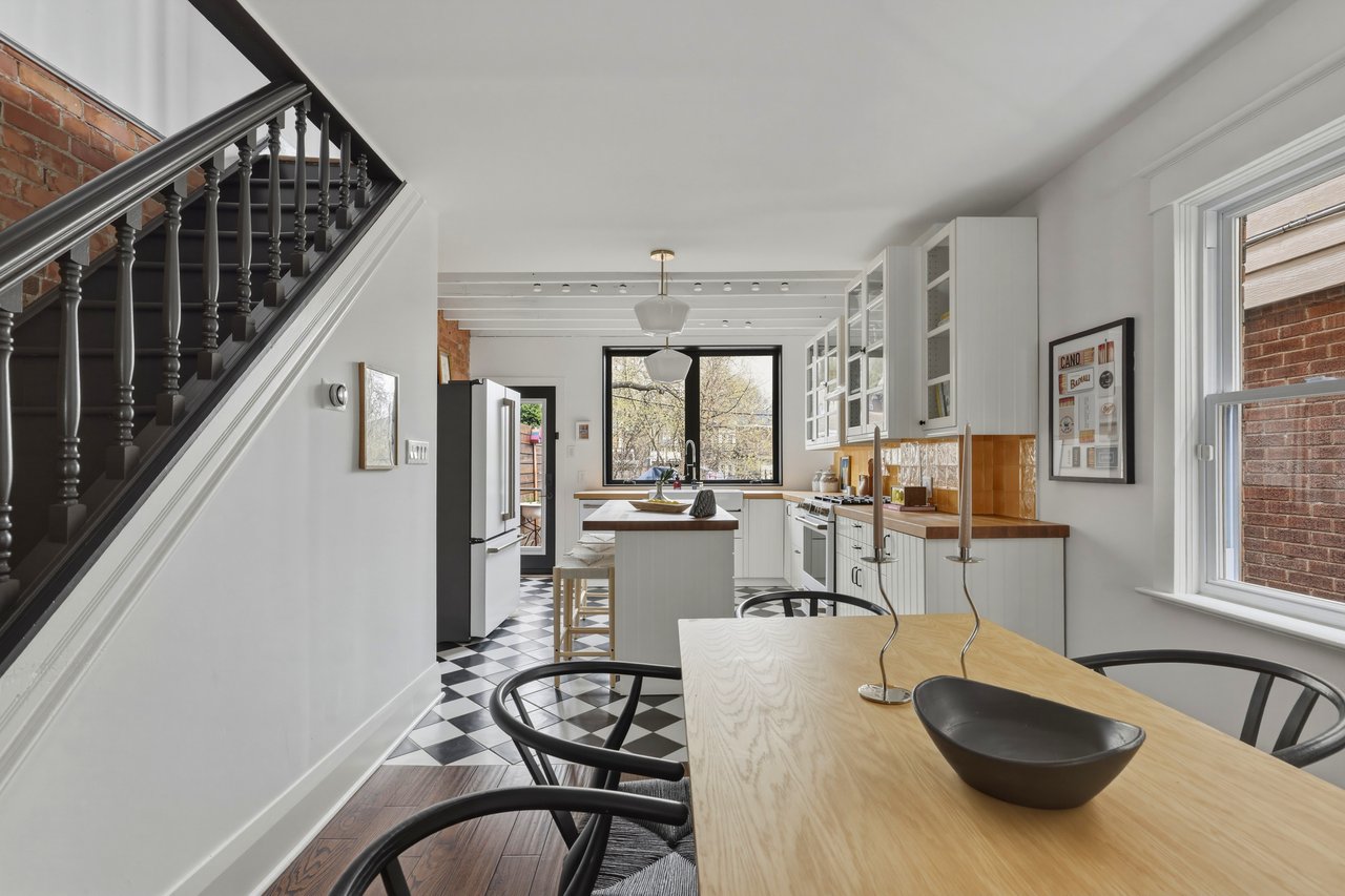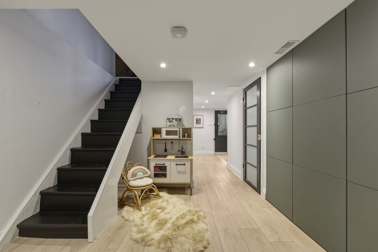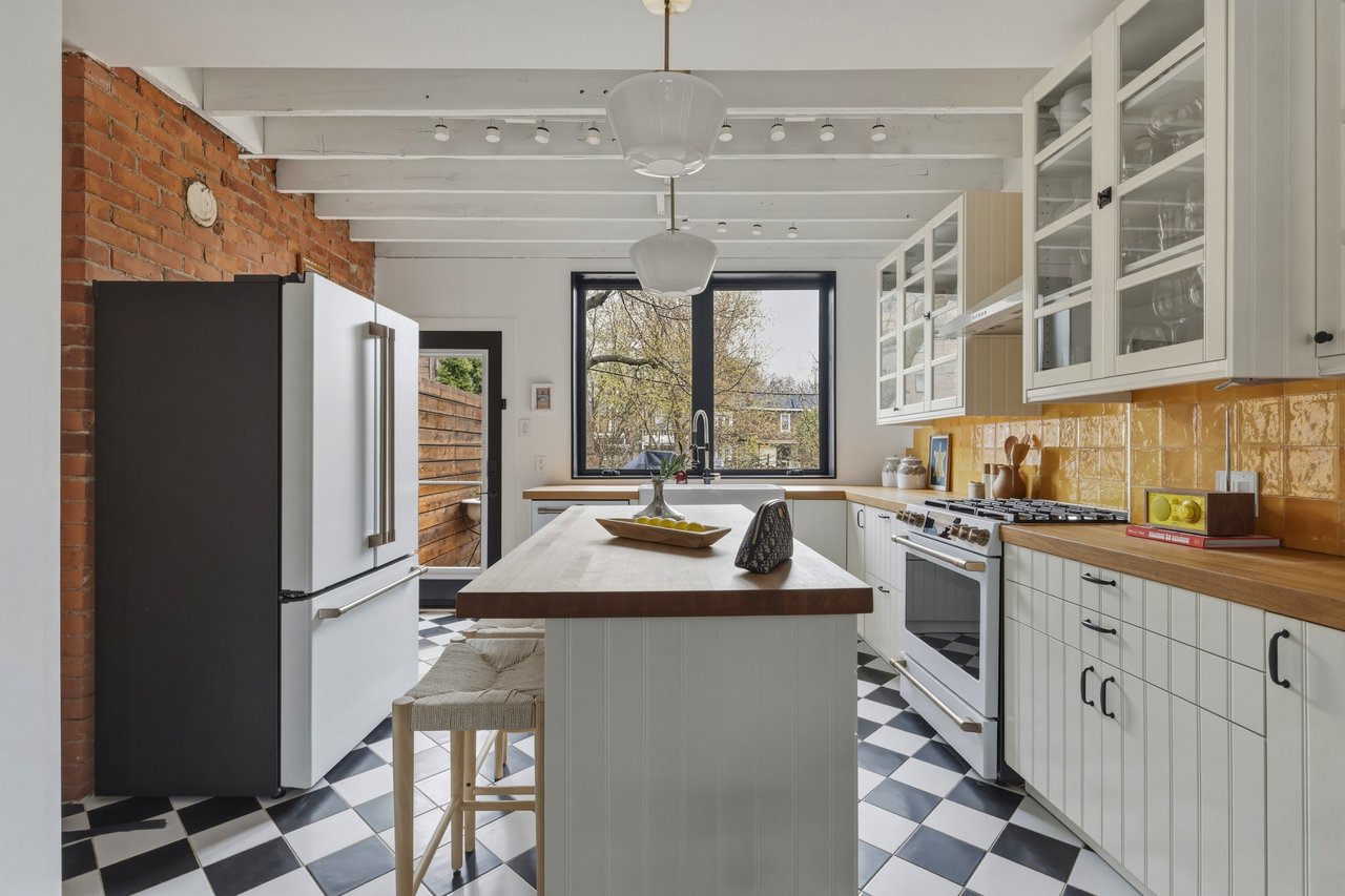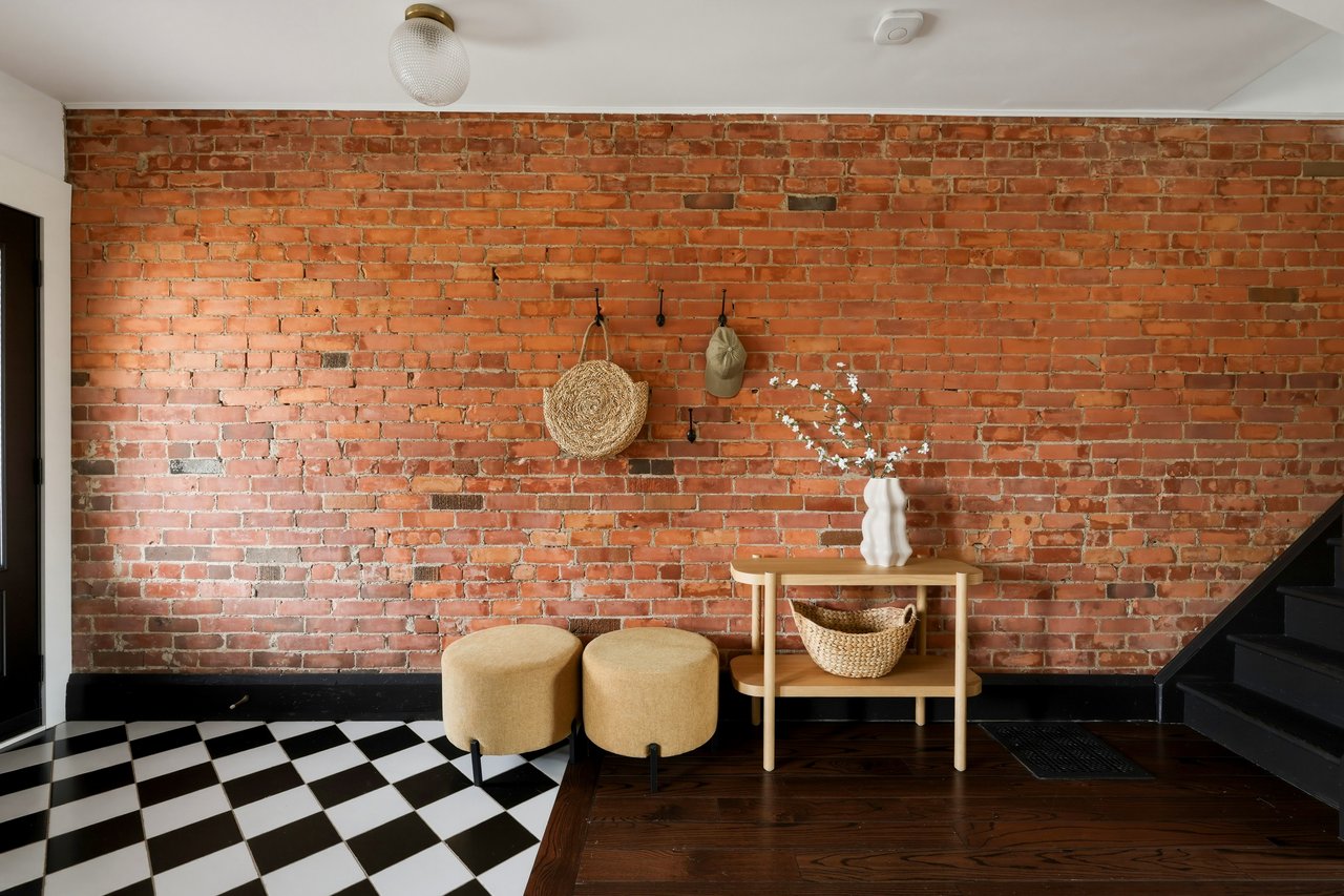 Exposed brick carries through the open main floor, living, dining, and kitchen connected front to back. Three generous bedrooms upstairs flex for whatever life looks like right now. The basement walks straight out to the yard with a mudroom and laundry at the entry. The kind of layout that makes entertaining feel easy and school mornings feel manageable.