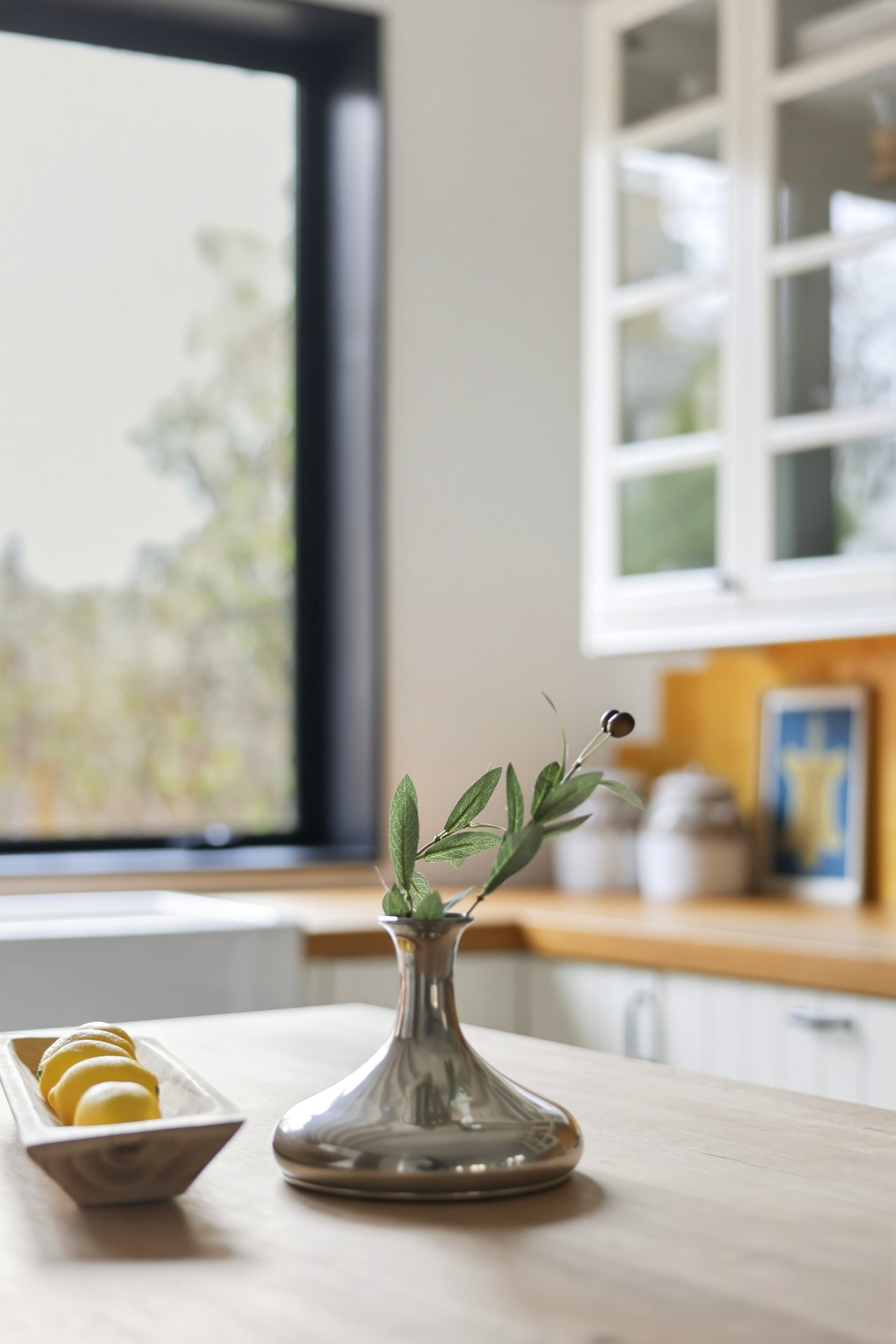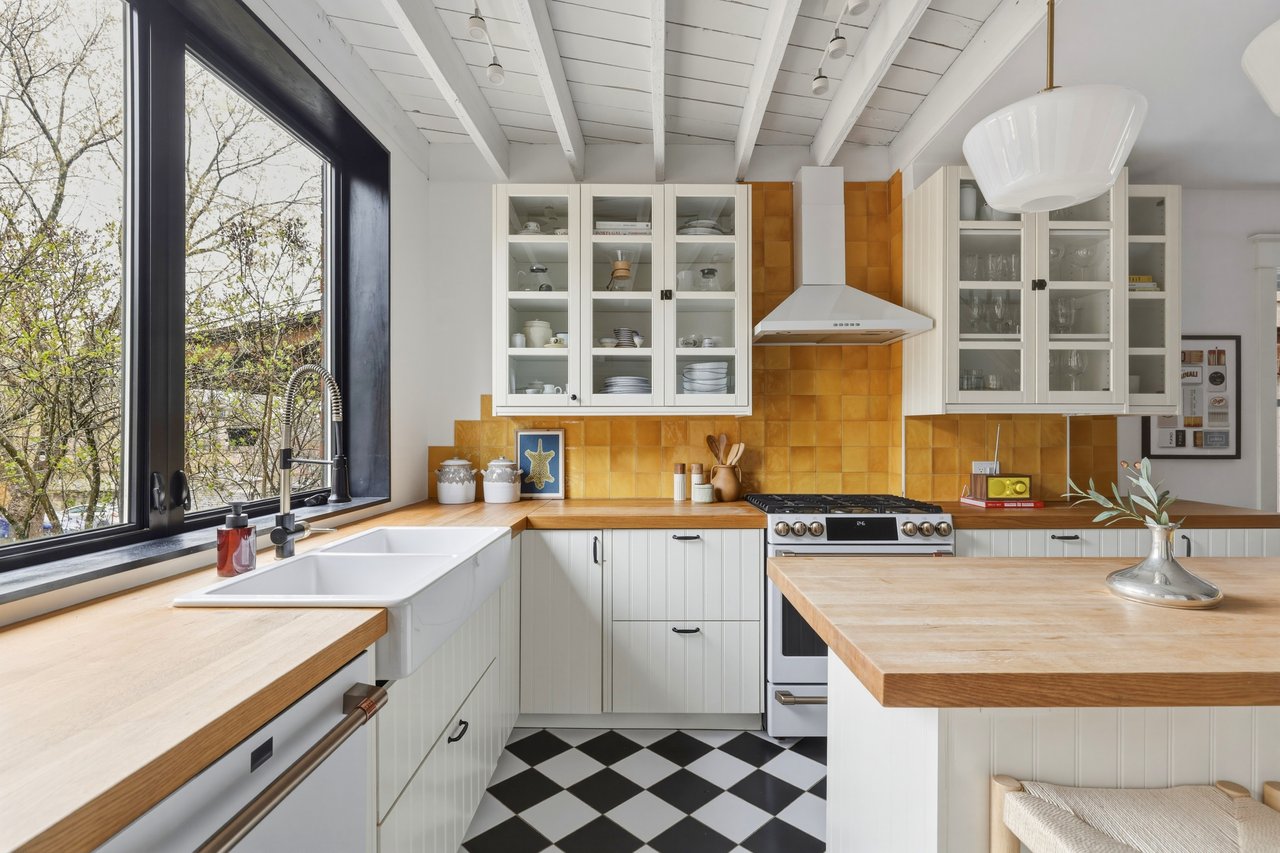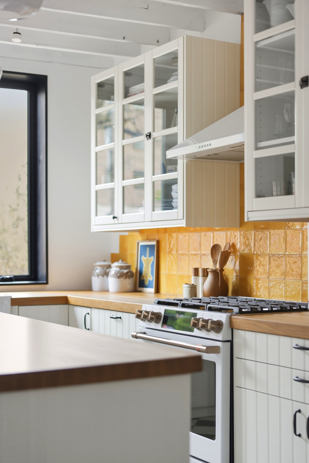 Inside, the kitchen window does something most kitchens don’t. It frames the space like a painting.